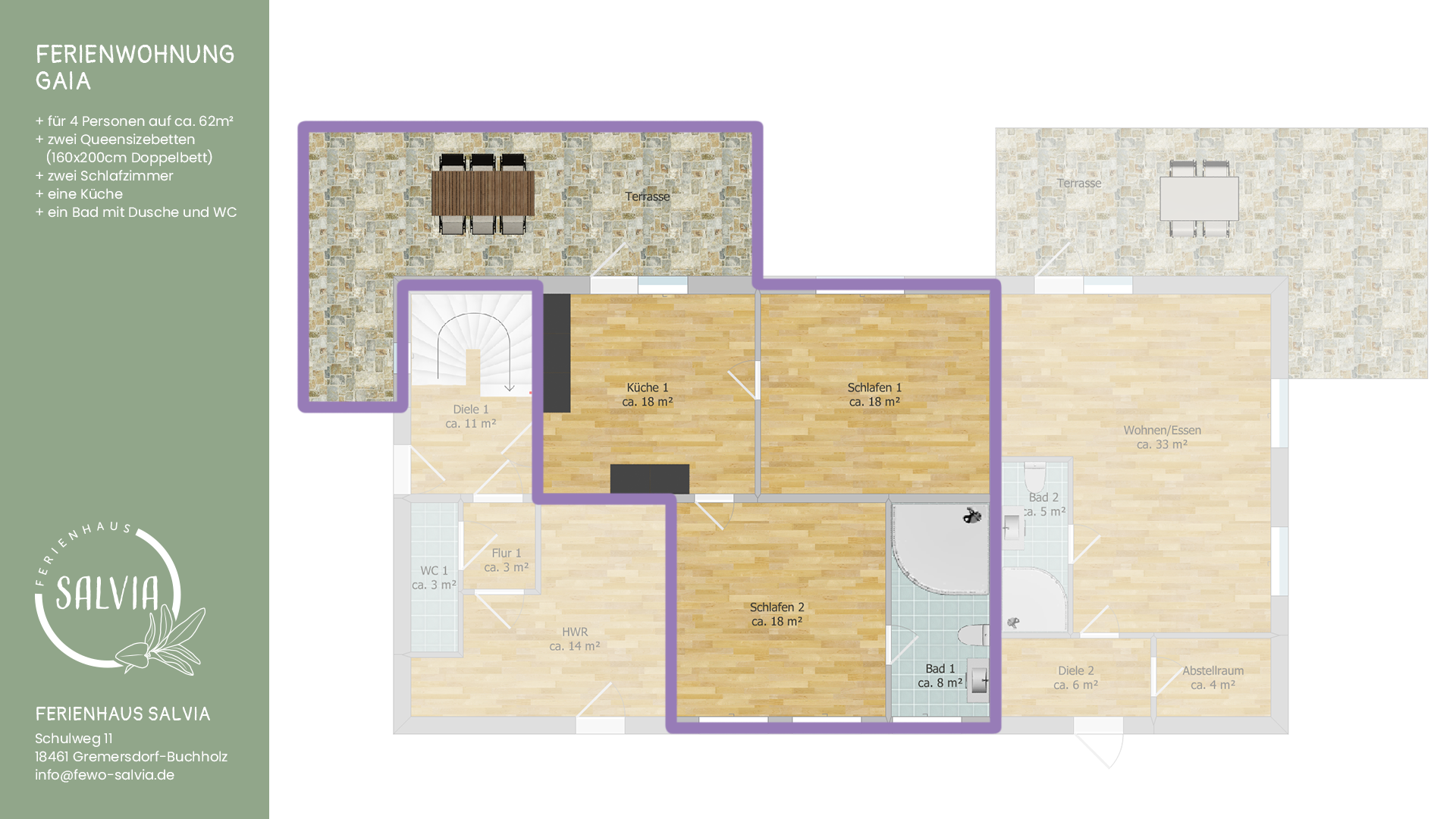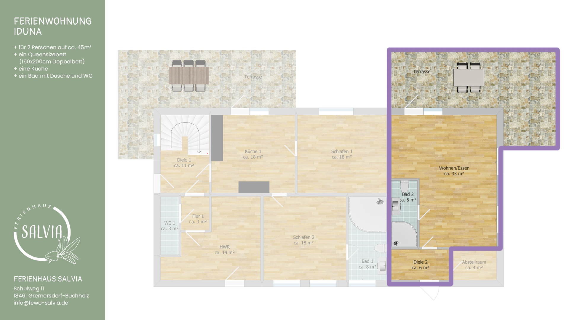 Unser Ferienhaus Salvia besteht aus 3 eigenständigen Ferienwohnungen, die einzeln oder auch als gesamtes Ferienhaus zusammen gemietet werden können.